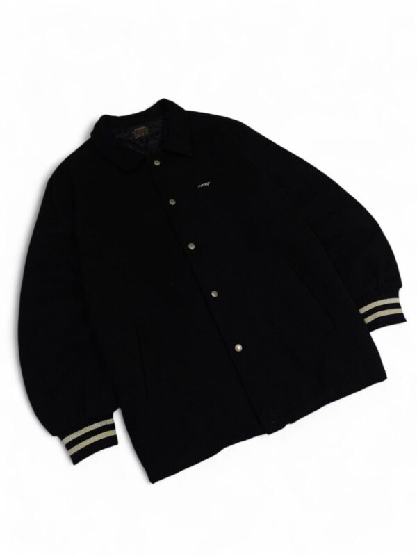 Design & Style: Hybrid coach / varsity jacket silhouette featuring a clean classic collar and snap-button placket