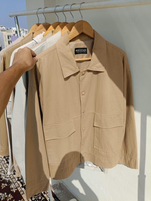 Details: Button-up front, chest pockets, and adjustable cuffs