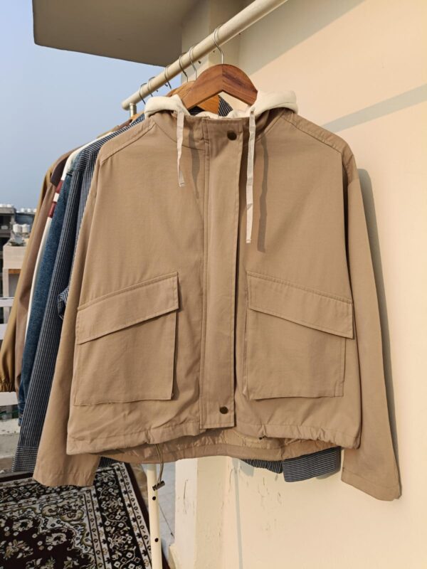 Colorway: Neutral Versatile Beige with a soft, Contrasting White Hood for an instant layered look.
