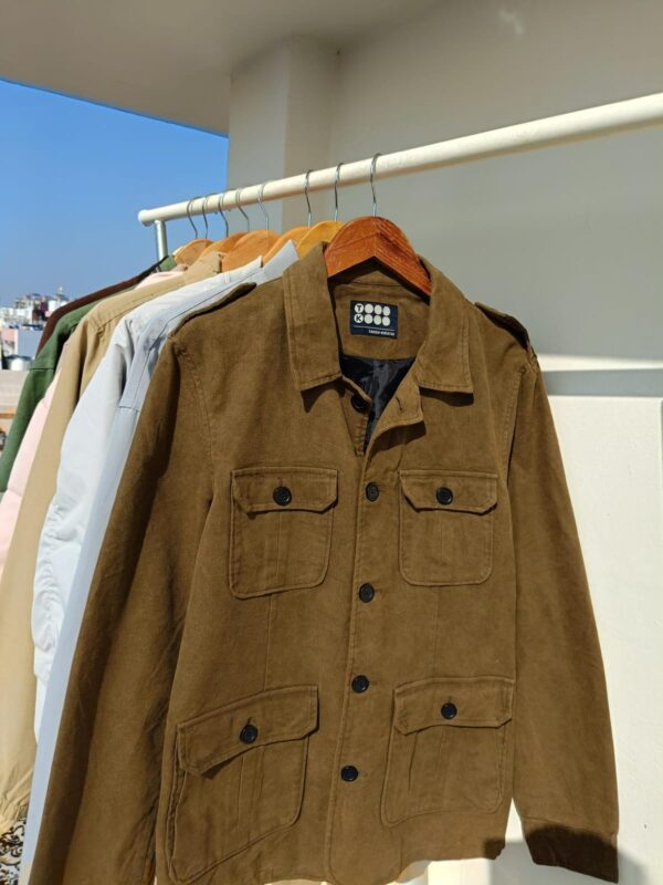 Structure: Features a clean, high collar and a covered placket for a streamlined finish. The fabric appears to have a subtle texture (possibly a fine corduroy or ribbed weave).